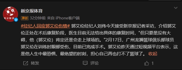 經(jīng)紀(jì)人回應(yīng)郭艾倫傷勢:正處康復(fù)階段 醫(yī)生無法給出具體康復(fù)時間