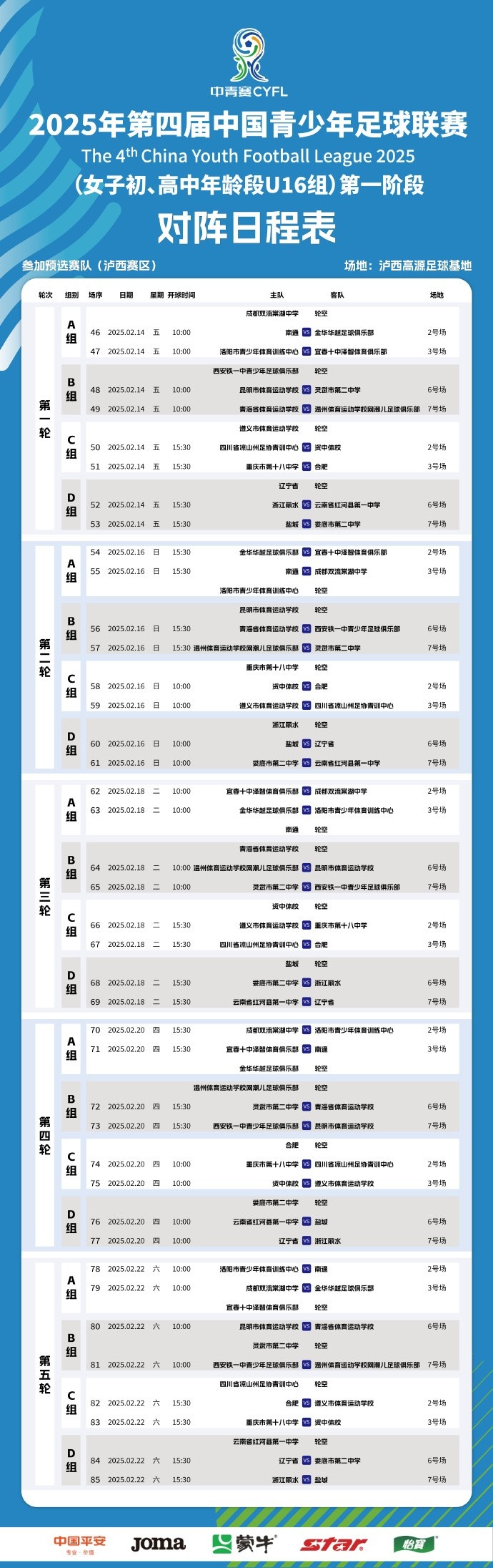中國青少年足球聯(lián)賽(女子初高中年齡段U16組)第一階段競賽日程