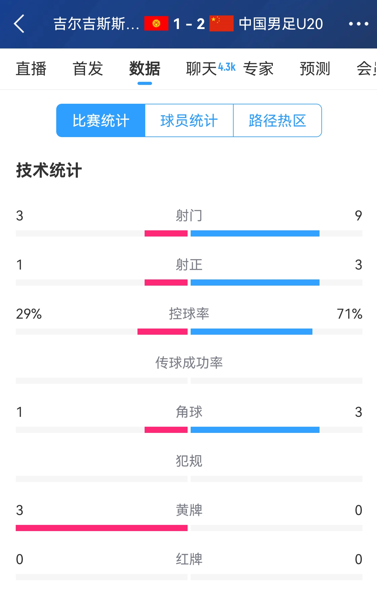 全面壓制!國青半場控球率高達(dá)7成,射門比9-3,造對方3張黃牌